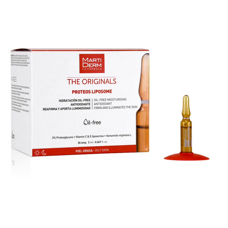 MartiDerm The Originals Proteos Liposome son un tratamiento facial antiedad sin aceite indicado para pieles mixtas, grasas y sensibles. Su textura ligera y fresca es ideal para este tipo de pieles, dejando una sensación suave no grasosa. También otorga un efecto astringente que cierra los poros, tonifica la piel, da firmeza a la dermis y retiene el agua, evitando la deshidratación cutánea. Estas ampollas actúan como antioxidantes y neutralizan los radicales libres de la exposición solar.