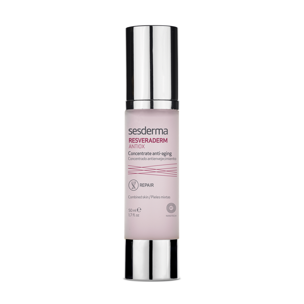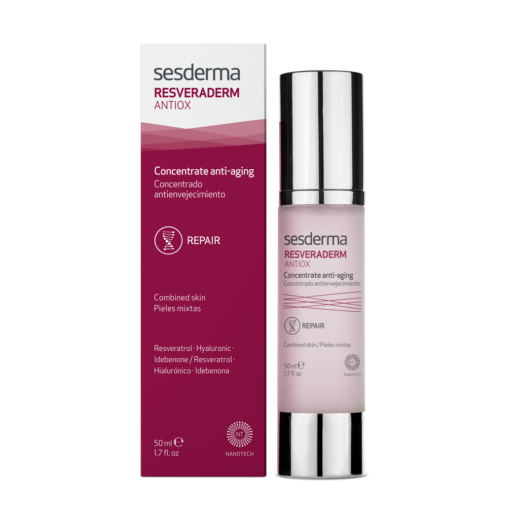 Resveraderm concentrado antienvejecimiento es un cóctel antioxidante para todo tipo de piel. Nueva generación de antioxidantes gracias a la aplicación de la nanotecnología, tecnología innovadora con la que se consigue transportar los activos, encapsulados en nanosomas, a las capas más profundas de la piel, y potenciar sus efectos. Sus beneficios son antioxidante, antienvejecimiento, antiarrugas, unifica el tono, efecto filmógeno (piel tersa) e hidrata