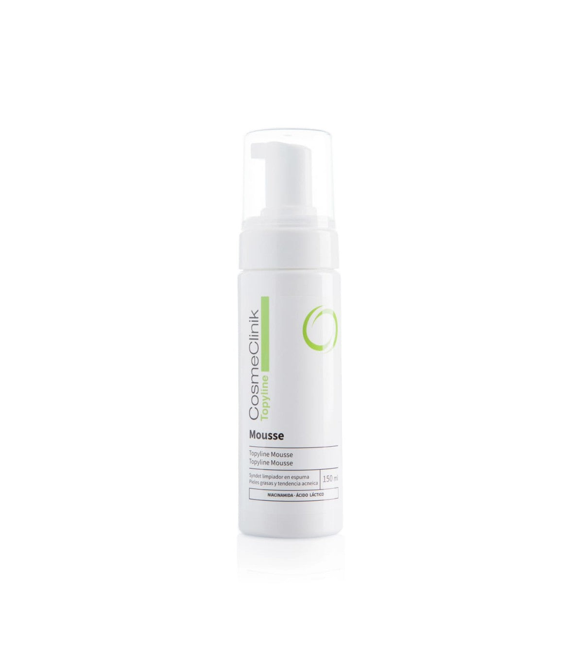 Topyline Mousse indicado para la higiene facial diaria de pieles grasas y con tendencia acneica. Espuma sin jabón, formulada con tensioactivos naturales, que ejerce una eficaz acción limpiadora a la vez que actúa sobre las imperfecciones cutáneas. Triple acción: queratolítica suave, agente regulador de la secreción sebácea y agentes que hidratan y calman la piel sin resecar. Permite desmaquillar y limpiar la piel de impurezas asociadas a la polución. Mejora la penetración de los tratamientos posteriores.