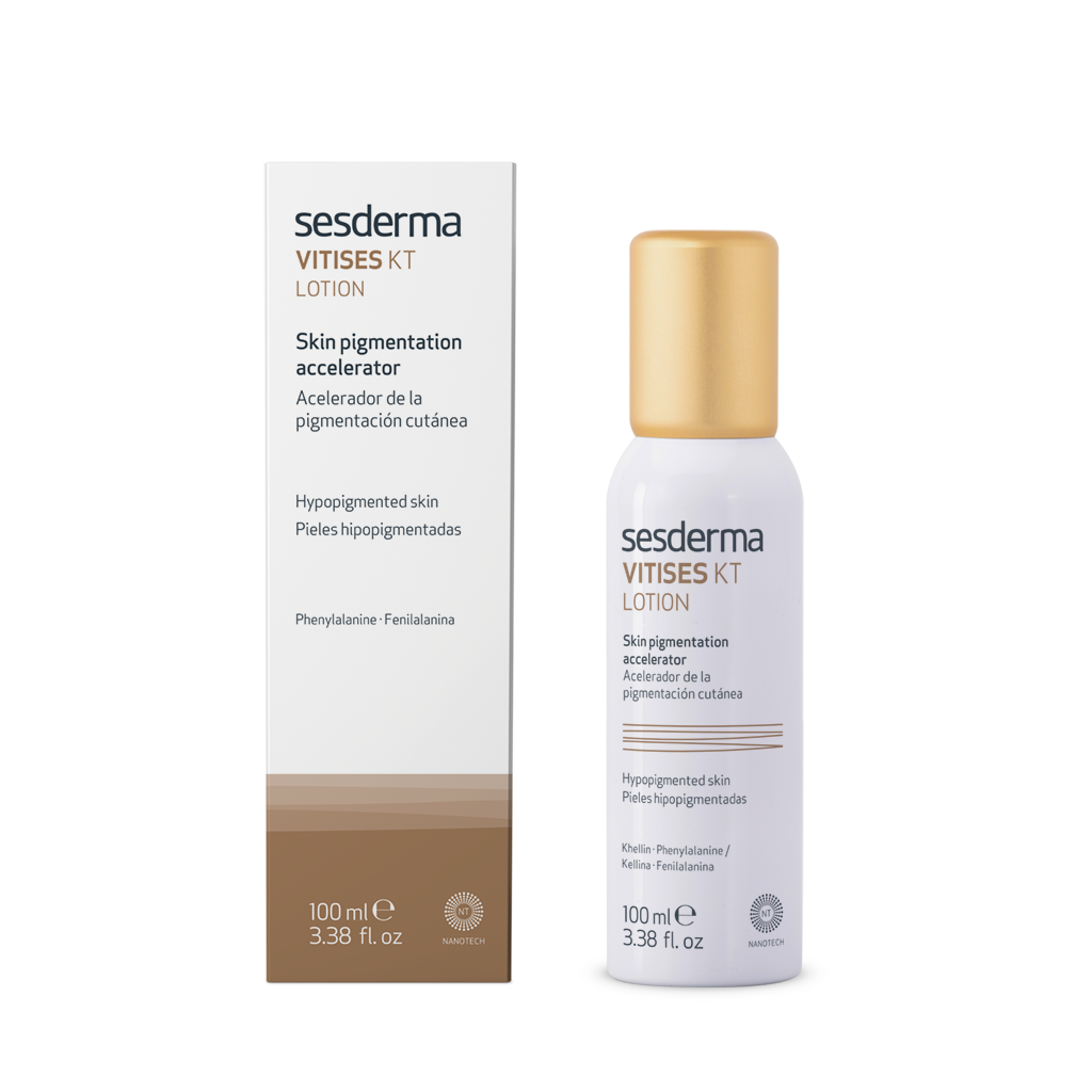 Pulverizar Vitises KT mist sobre las lesiones hipopigmentadas 30 minutos antes de la exposición solar.