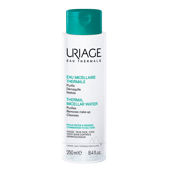 Uriage Agua Termal Micelar piel mixta a grasa logra desmaquillar y limpiar el rostro, incluso maquillajes Waterproof, al tiempo que realiza una acción reguladora del sebo que deja la piel limpia y nítida.