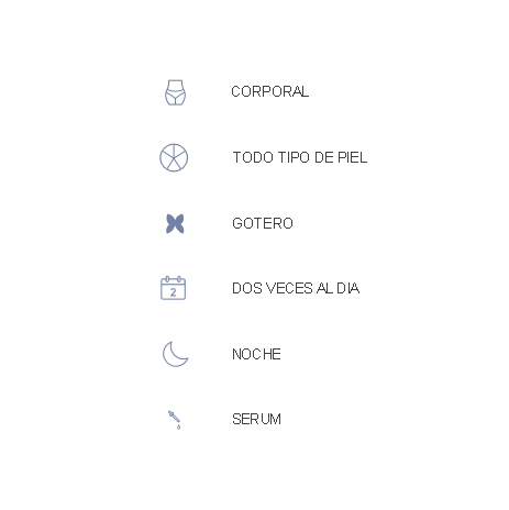 Tratamiento intensivo de choque a base de retinol y Vitaminas C y E en alta concentración con propiedades reparadoras y regeneradoras, exfoliantes, protectoras e hidratantes. Indicado para estrías hialinas, de color blanco-nacarado. Por su composición en retinol, no se recomienda durante el embarazo.