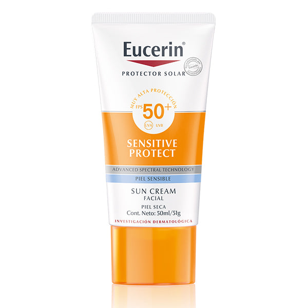 La Eucerin Sun Cream SPF 50+ es un protector solar avanzado diseñado para proteger el rostro del envejecimiento y las manchas de pigmentación. Para piel normal y seca. Resistente al agua.