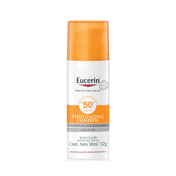 Eucerin Sun Fluido Anti-Edad FPS 50 es un protector solar diario para todo tipo de piel. Además de proteger el rostro de las quemaduras y otros daños provocados por el sol, también reduce visiblemente los signos de envejecimiento. La fórmula combina dos tecnologías de punta que brindan una fotoprotección superior contra el daño UV, incluyendo las manchas de envejecimiento, y una intensa hidratación para reducir visiblemente la aparición de arrugas en el rostro, cuello y escote.