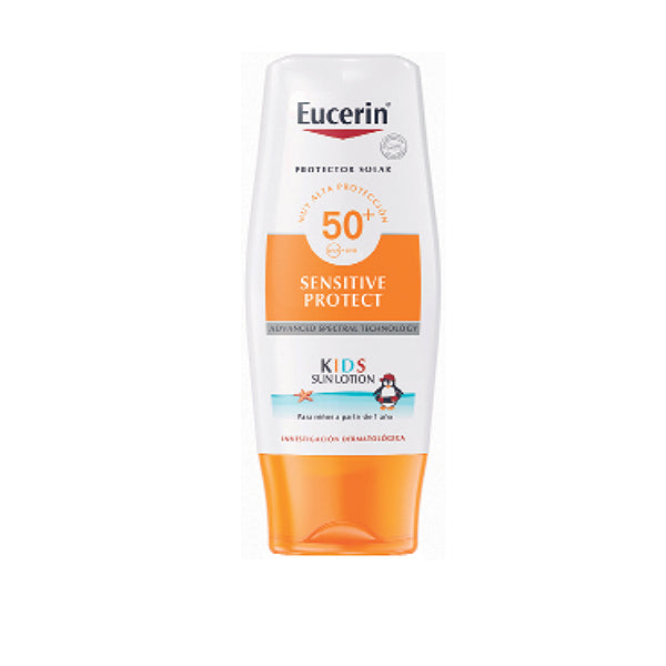 Eucerin Sun Kids Loción FPS 50+ está especialmente desarrollada para proteger a los niños de más de 1 año de edad de las quemaduras solares y brindar protección celular biológica para reducir el riesgo de los daños en la piel a largo plazo inducidos por los rayos UV. Es libre de parabenos, colorantes y perfumes. Extra resistente al agua.